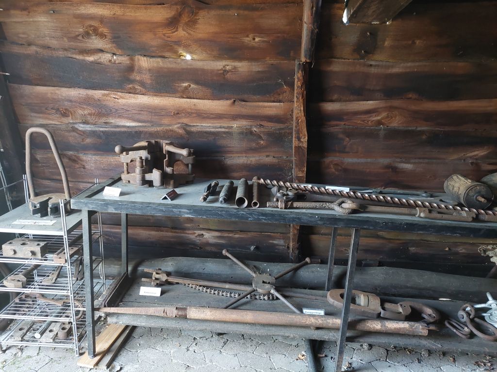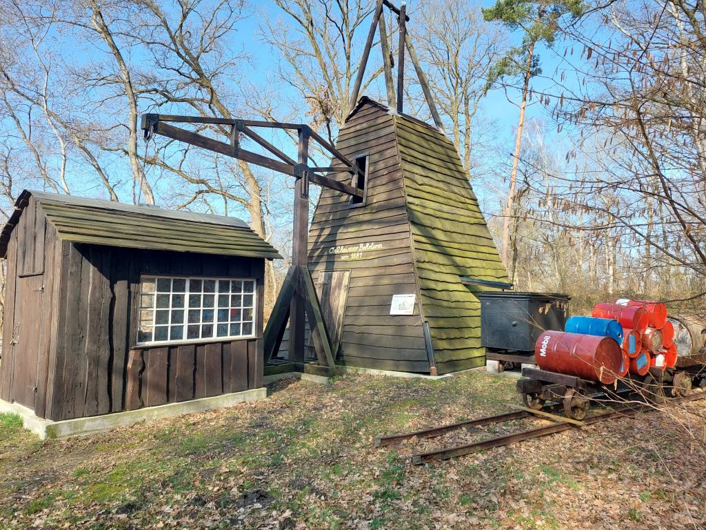 Es folgten das Maschinenhaus, Verlegung der elektrischen Leitungen, Installation der Umlaufpumpe, Verlegung des Gleises für die Ölfässer und zum Schluss Bestückung des Innenraumes mit historischen Bohrwerkzeugen.